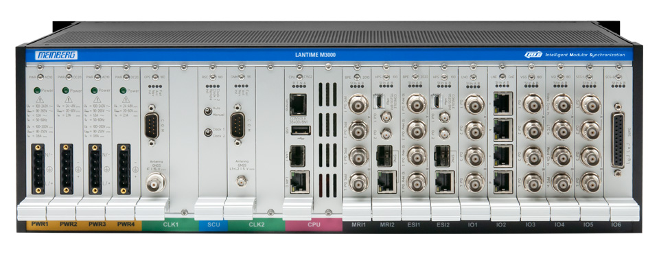 The M3000 is the first product in Meinberg’s new IMS Series (Intelligent Modular Systems), offering built-in redundancy for synchronisation sources, power supplies and cooling in combination with a highly modular slot based chassis supporting hot-swapping and field expansion capabilities. The 18 slot 3U rack-mount design of the Lantime M3000 allows the use up to 4 power supplies, two clock modules, a switch module, a CPU board and 10 I/O slots.