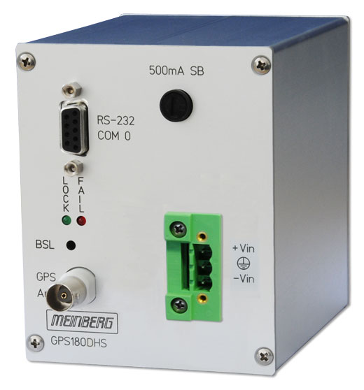 The satellite controlled clock GPS180XHS is designed for mounting on a DIN rail. The front panel integrates two LED indicators, a hidden push button, a DSUB- and a BNC-connector. The receiver is connected to the antenna/converter unit by a 50 O- coaxial cable with length up to 300 m. It is possible to connect up to four receivers to one antenna by using an optional antenna diplexer.